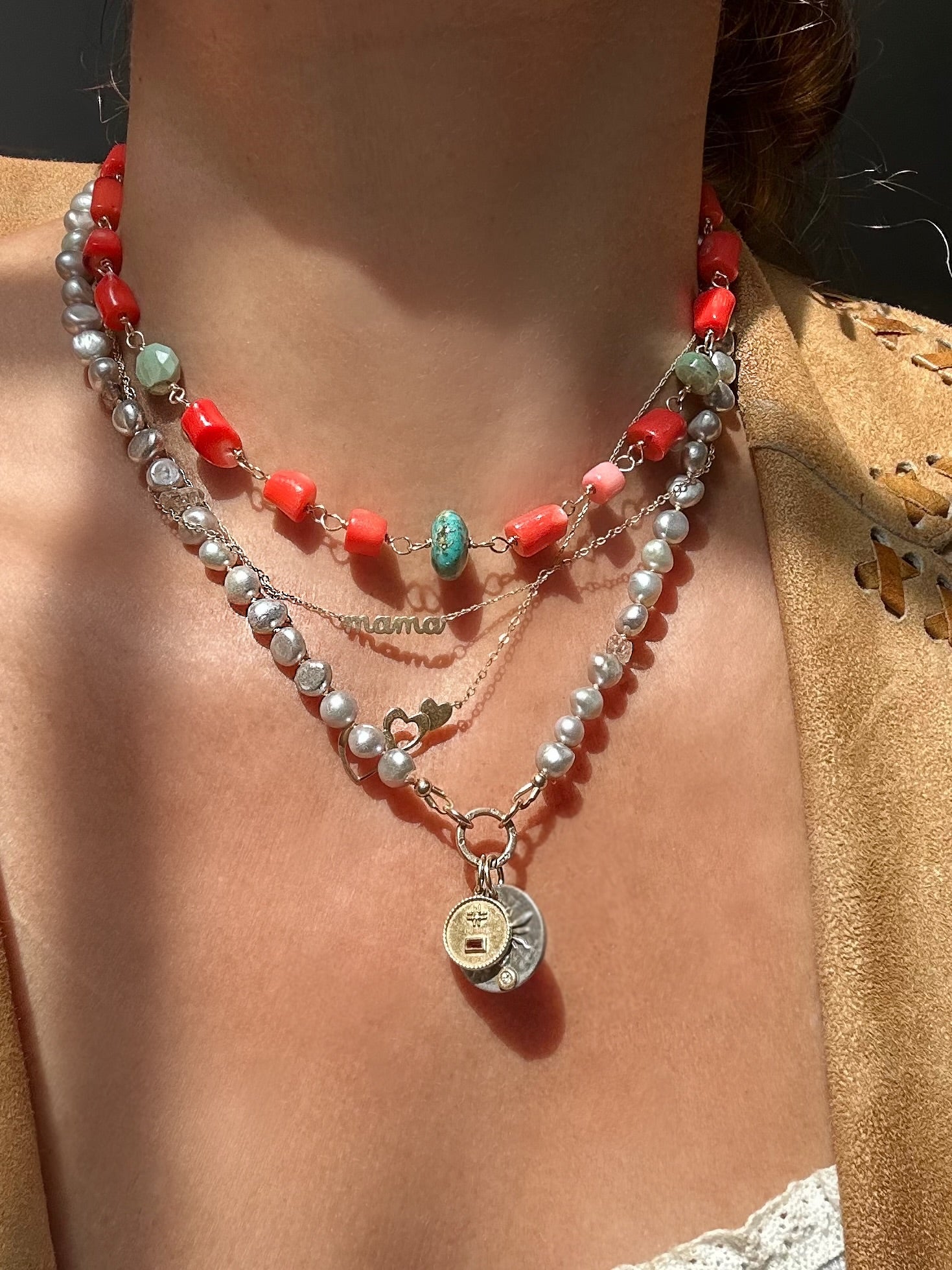 Peach coral beads, turquoise, and chrysoprase accents wrapped in gold filled wire creates a harmonious color palette that is reminiscent of lying on a tropical sandy beach. Choker style necklace, added gold filled extender to lengthen.