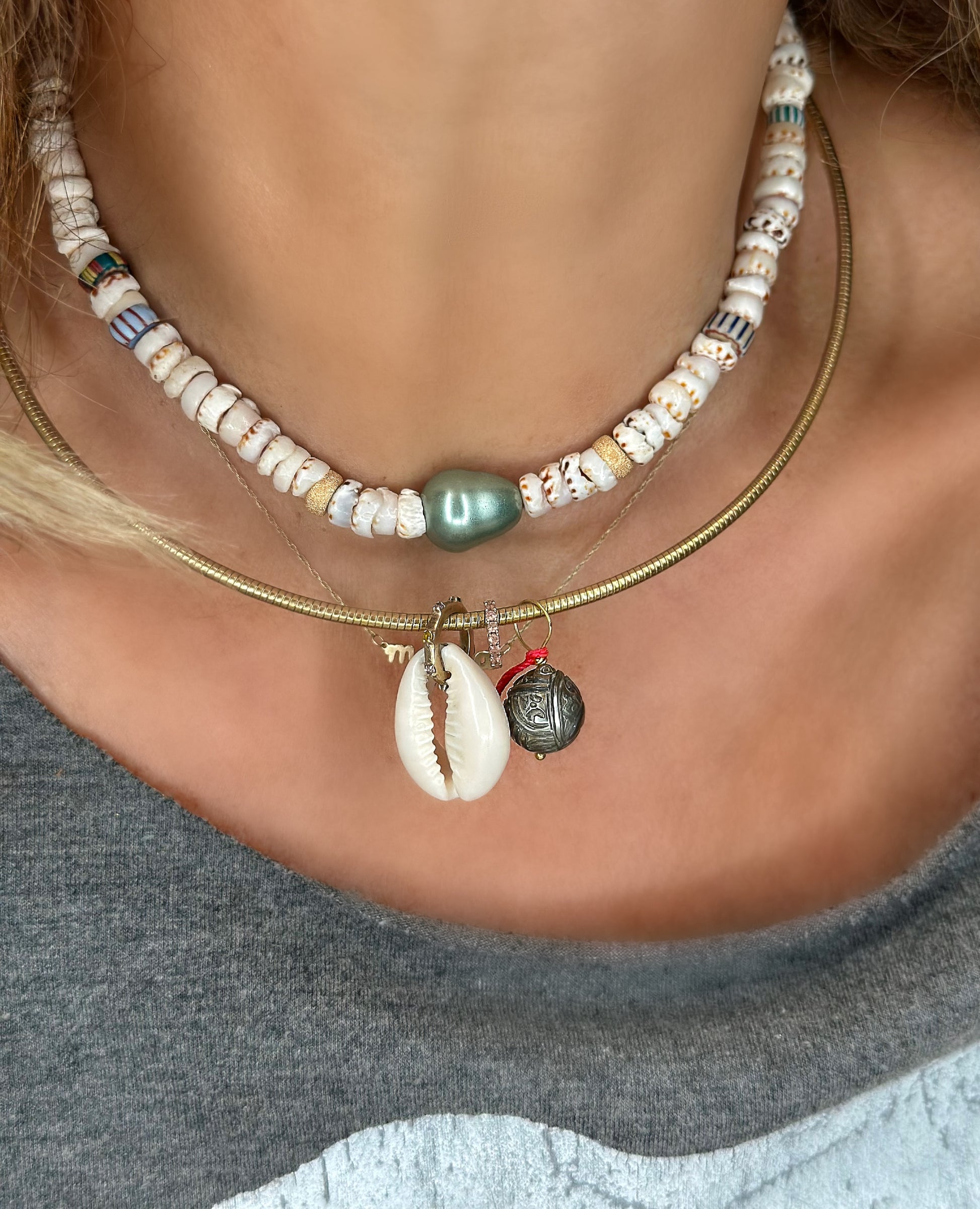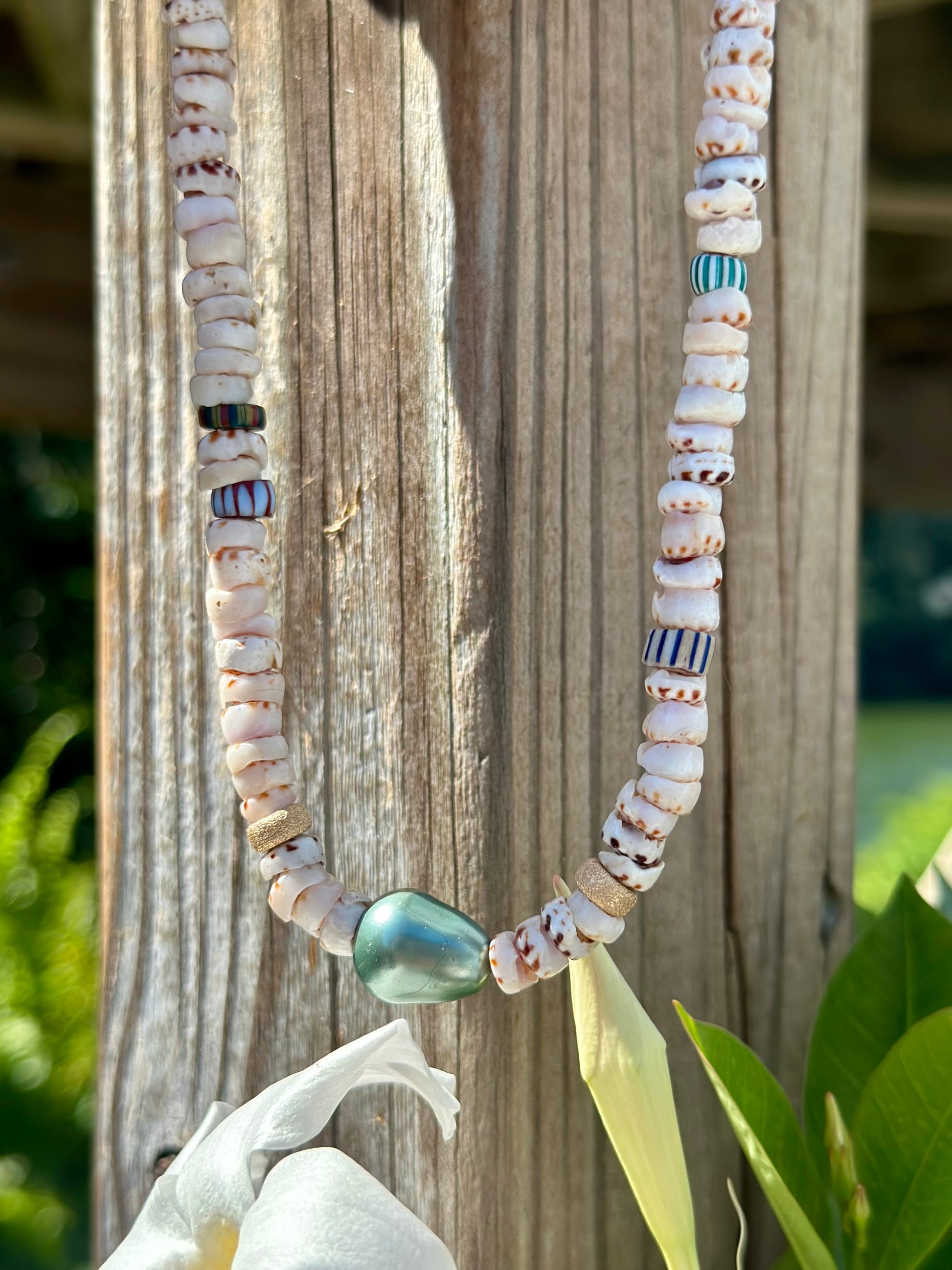 White puka shells with trade bead accents, lustrous gold stardust beads, and a teal blue pearl come together in the Lagoon Glow Necklace. Inspired by tranquil lagoons and warm coastal breezes, this brings a touch of seaside elegance to any look.