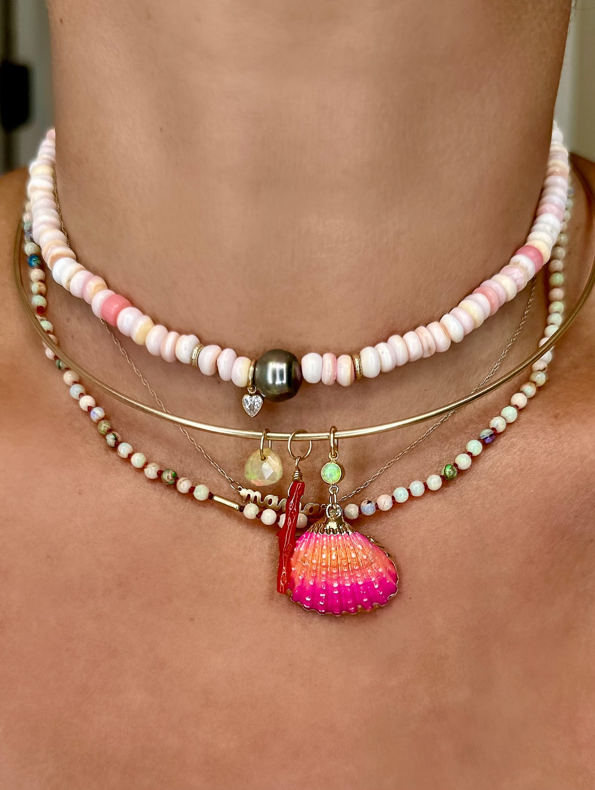 Blush pink shell beads with bright pink accents, Lustrous Tahitian pearl and gold filled, sparkling, CZ heart. Feels like falling in love under a full moon! Choker style necklace, comes with gold filled extender chain to lengthen.