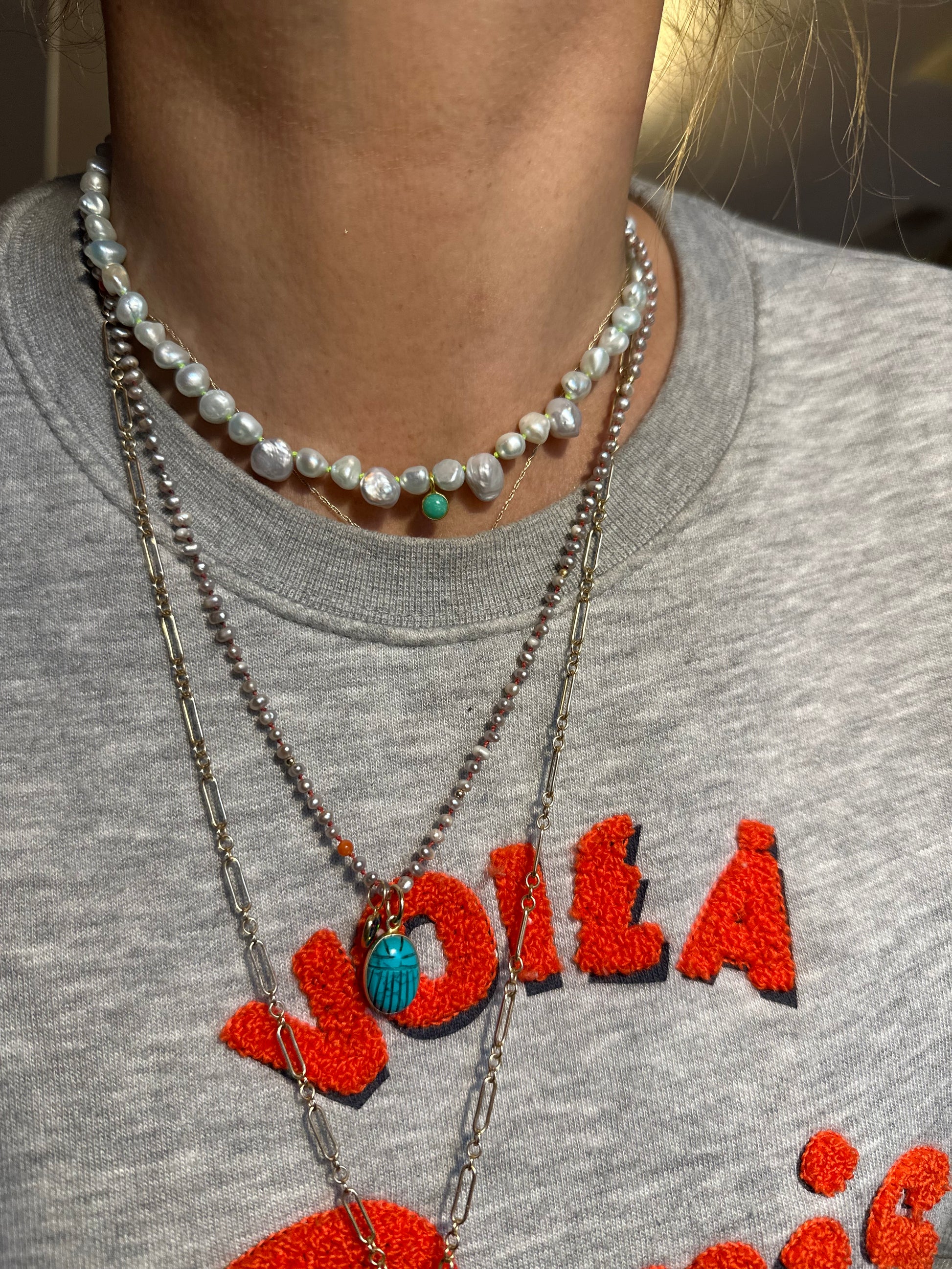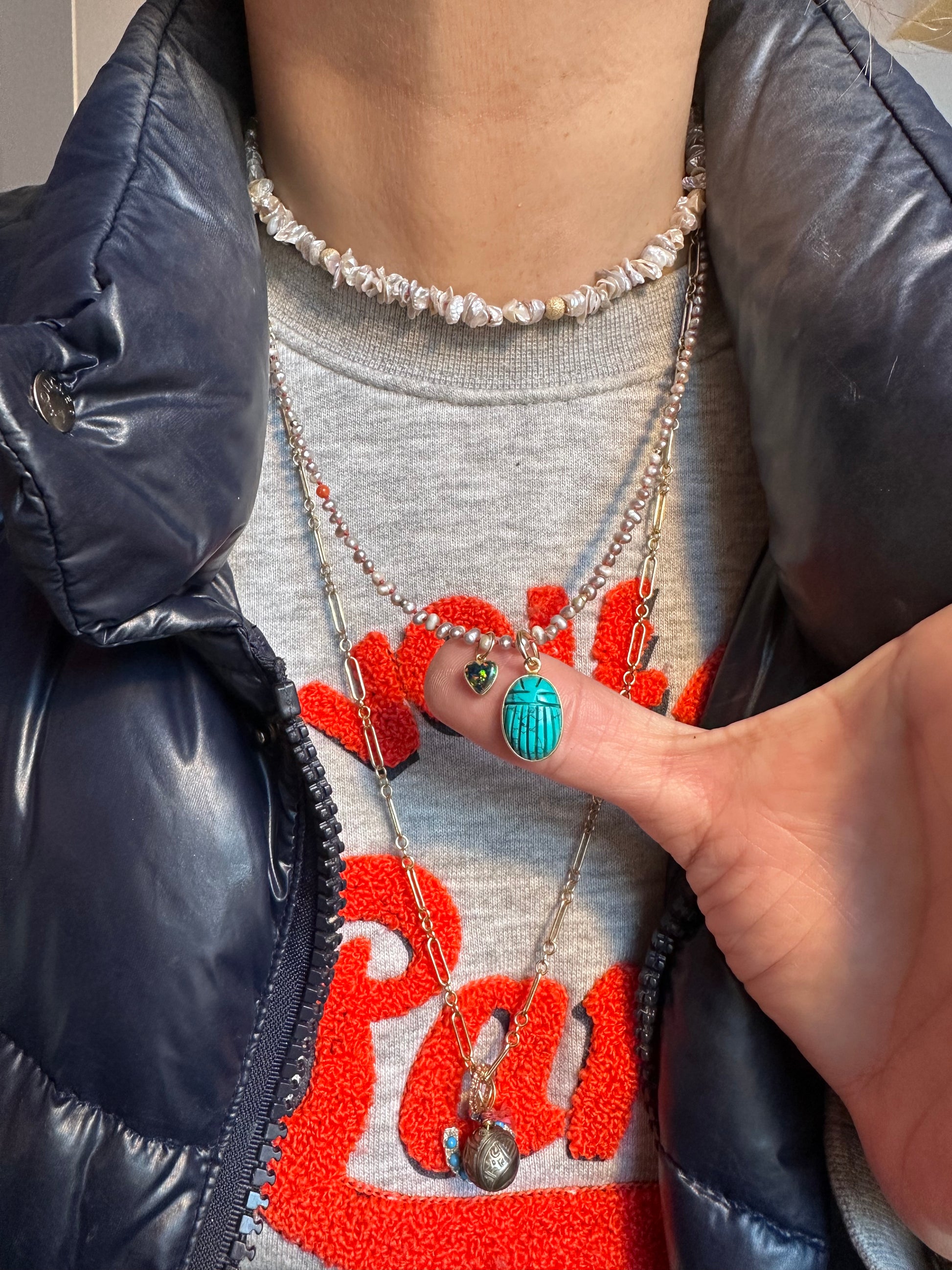 The scarab represents rebirth and transformation, a great symbol to help with manifesting. Genuine carved Turquoise scarab, charm is set in gold vermeil.